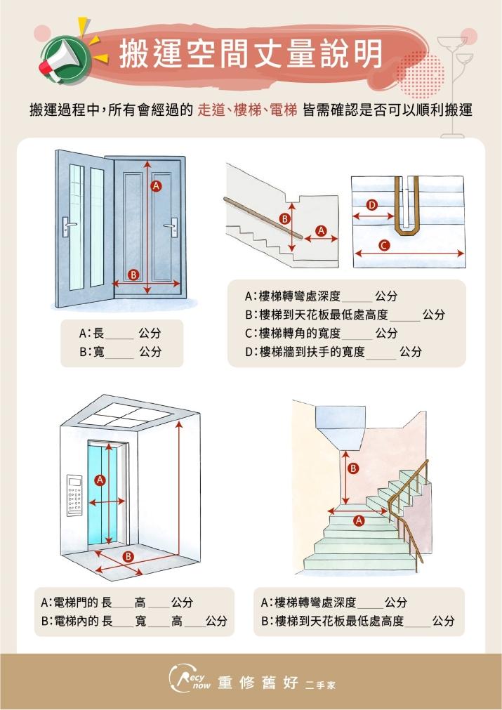 這張搬運空間丈量說明圖,大家可以直接在空白畫線處填入家裡家外數值,確保新家具能順利入厝!